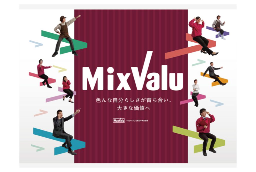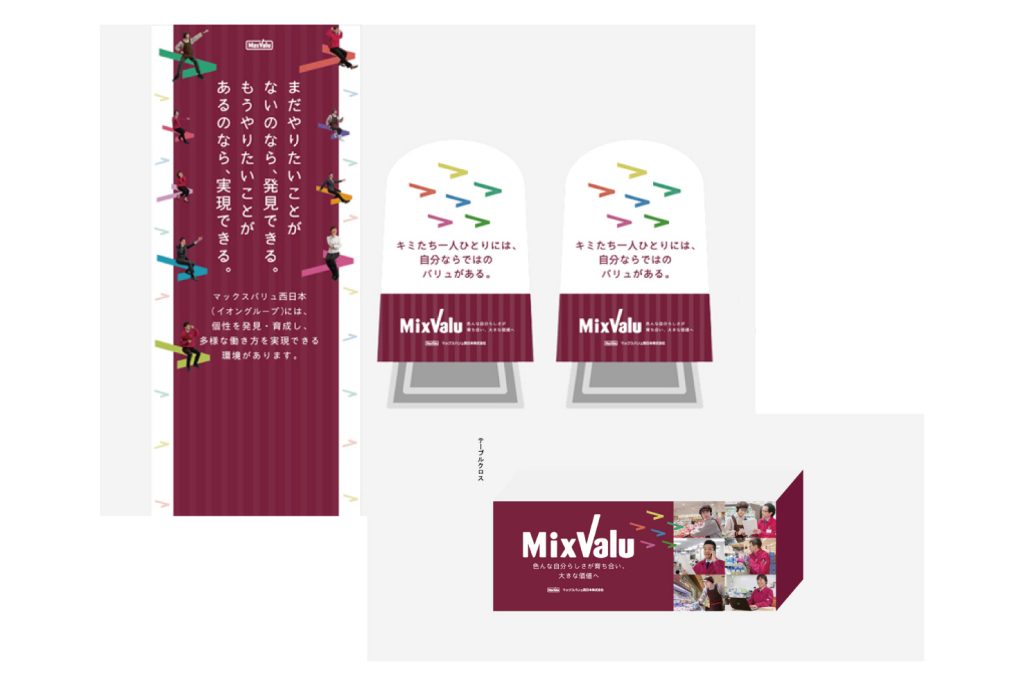 多様な職種があり、組織規模・制度・社風などによって、あらゆる個性が育つマックスバリュ西日本さまの特長を踏まえ、「Mix Valu ~色んな自分らしさが育ち合い、大きな価値へ~」という採用スローガンを策定。パンフレットをはじめ、リクナビツール一式や装飾ツールなどへ一貫性を持って展開しました。