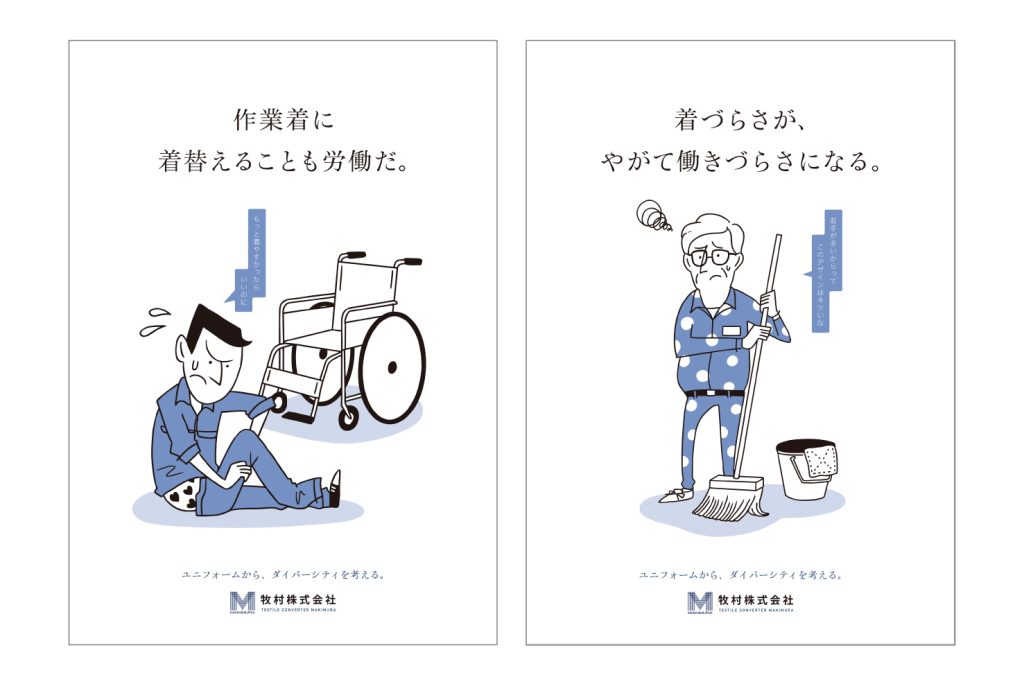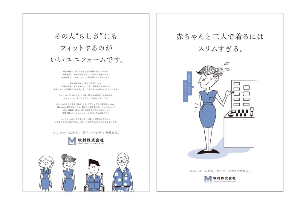 定期的に開催される展示会のコンセプト「ダイバーシティから、ユニフォームを考える。」を考案し、その展開として啓蒙・理解のための装飾ポスターを作成しました。